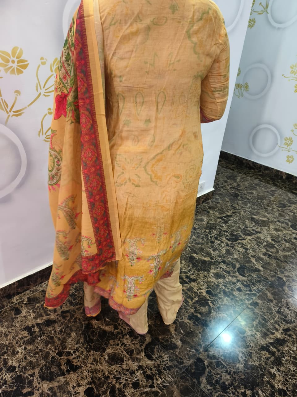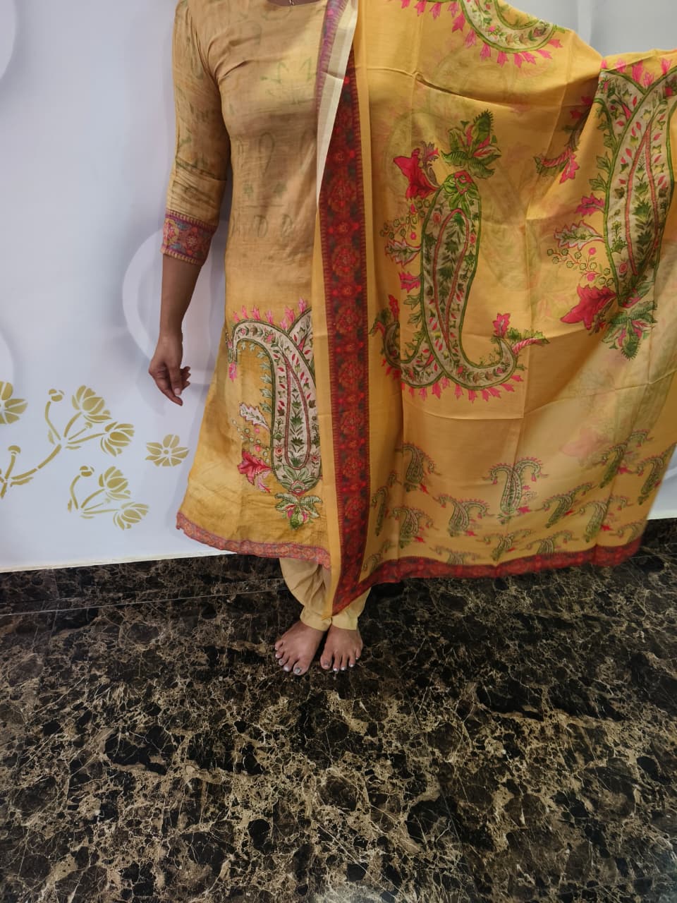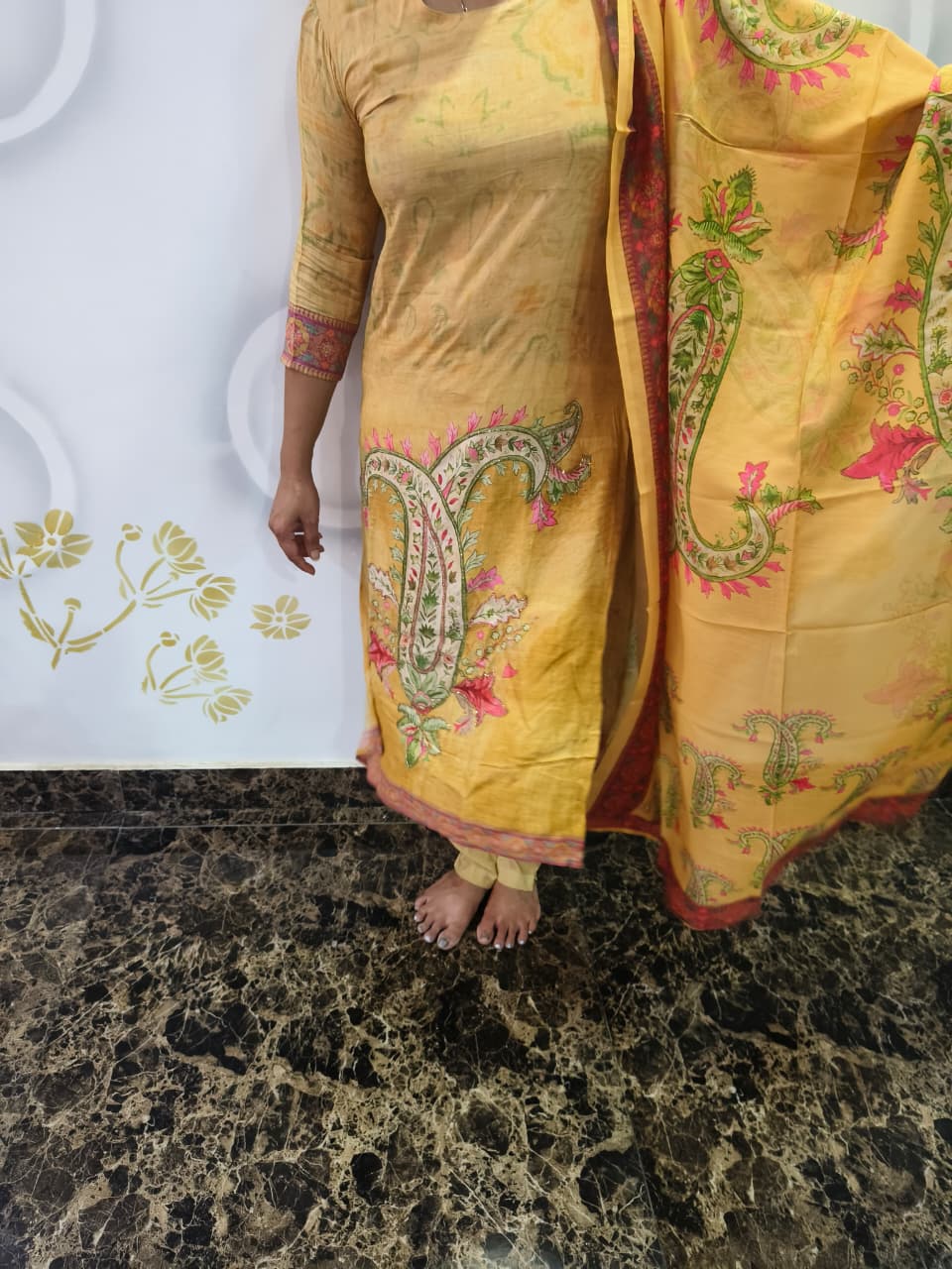 Elevate your ethnic collection with this graceful light mustard pure silk suit set, designed for those who appreciate understated luxury. Crafted from rich pure silk, this ensemble features finely detailed hand embroidery that reflects timeless craftsmanship. The soothing light mustard hue offers a perfect blend of elegance and warmth — ideal for festive gatherings, daytime functions, or cultural events.
