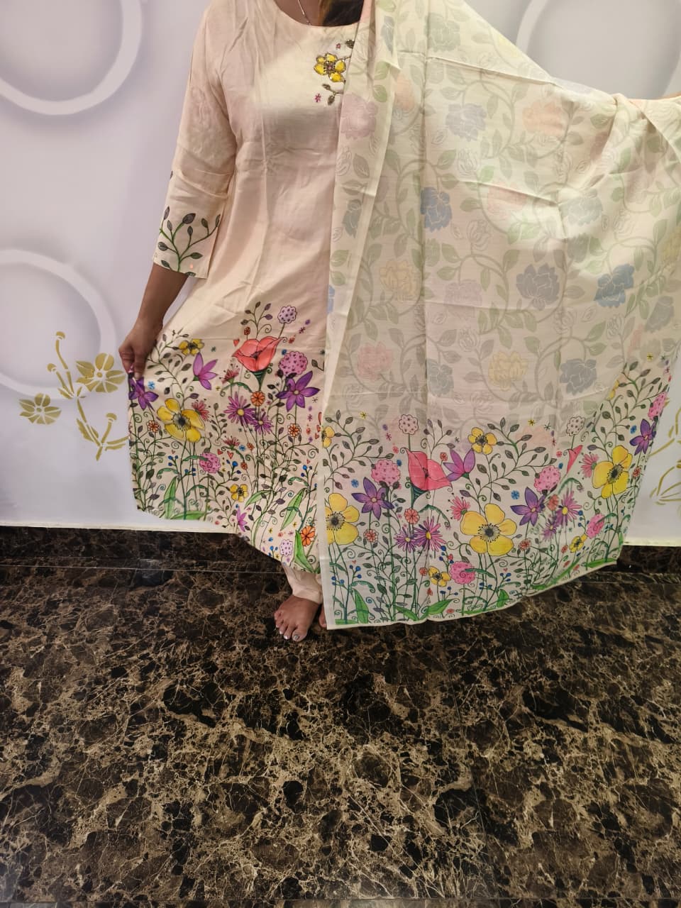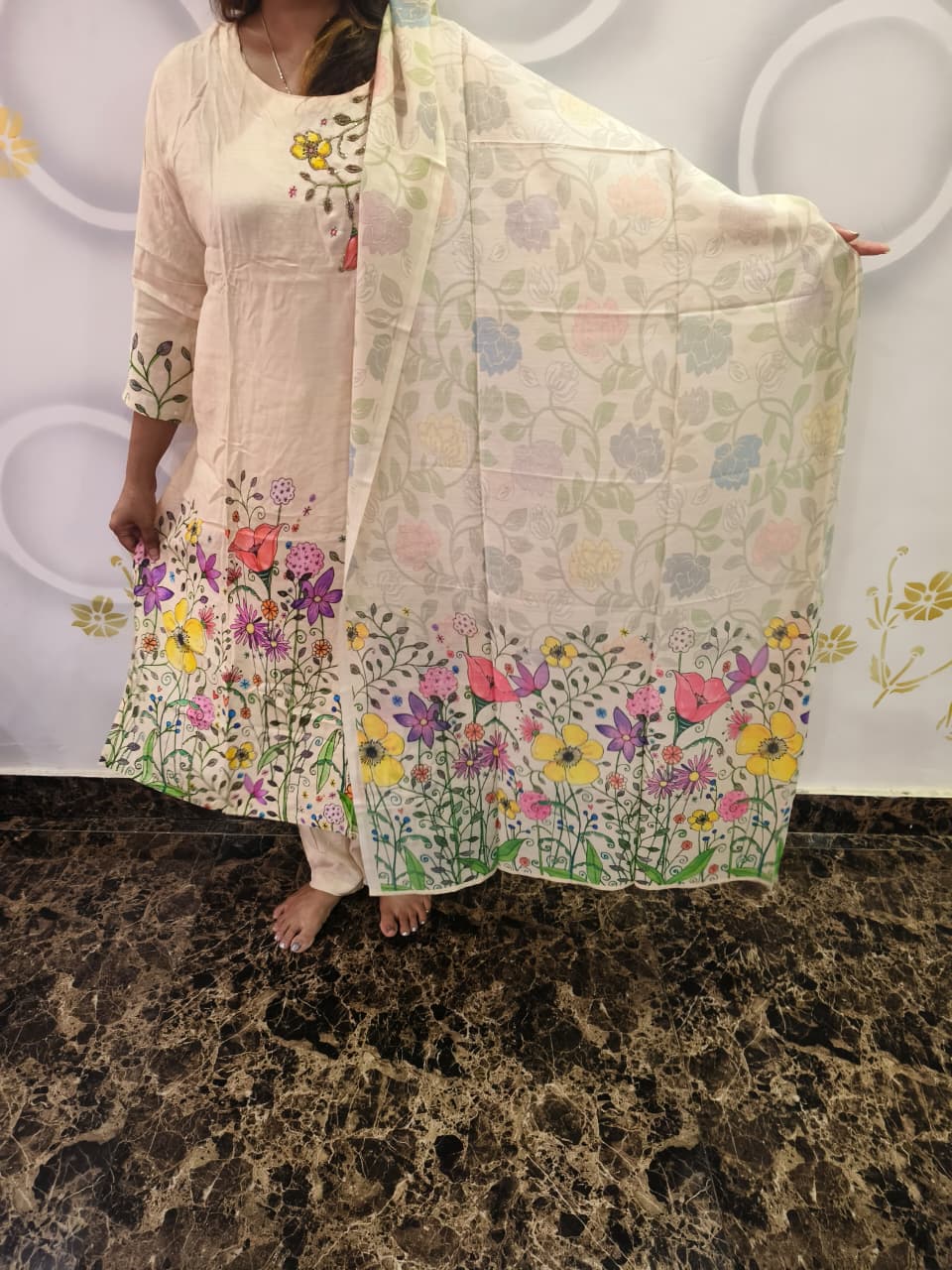 Step into timeless elegance with this off-white pure silk suit, exquisitely handcrafted to perfection. Made from premium quality silk, this outfit features detailed hand embroidery that adds a rich, luxurious charm. The subtle off-white shade makes it ideal for both day and evening occasions — from festive celebrations to formal gatherings.